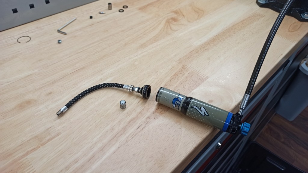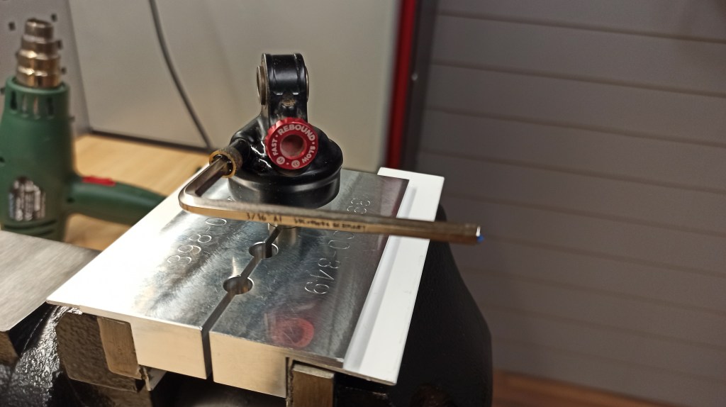 La segunda dificultad, la resolví gracias a la comprensión del mecanismo y una vez más, a la propia fabricación de un útil para poder sacar todo el aire del sistema hidráulico del interior del amortiguador.
